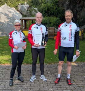 Während der gemeinsamen Pause in Lontzen fand die jährliche Urkundenverleihung statt, bei der Breitensportleiter Karl-Heinz Klein, assistiert von Schwalbe-Mitglied Verena Hansen, Urkunden an die Teilnehmer mit einer runden Anzahl von Radtouren überreichte. Geehrt wurden Lars Zippel und Peter Stoffel (jeweils 25 Fahrten), Jürgen Theissen, Monique Reinartz und Dietmar Kleeb (jeweils 50), Helmut van Booven (75), Elmar Zippel und Fritz Vaaßen (jeweils 100) sowie Gabriele Gobbelé (150). Die beiden Jubilare mit 100 Touren erhielten zusätzlich eine Flasche Sekt. Besonders erwähnenswert ist, dass Elmar Zippel jetzt 80mal in Folge ohne Unterbrechung als Tourenleiter dabei ist und damit 9 Jahre lang keine Tour verpasst hat. Das ist ein neuer Rekord in der Geschichte der Schwalbe.